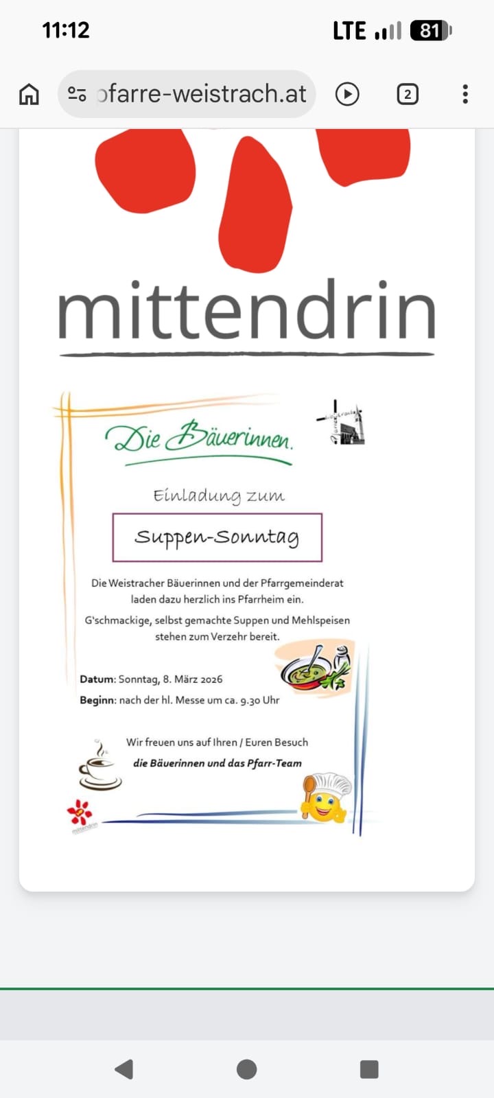 HL. MESSE, vorher ROSENKRANZ, anschl. FASTENSUPPE (Pfarrheim; Bäuerinnen u. PGR)