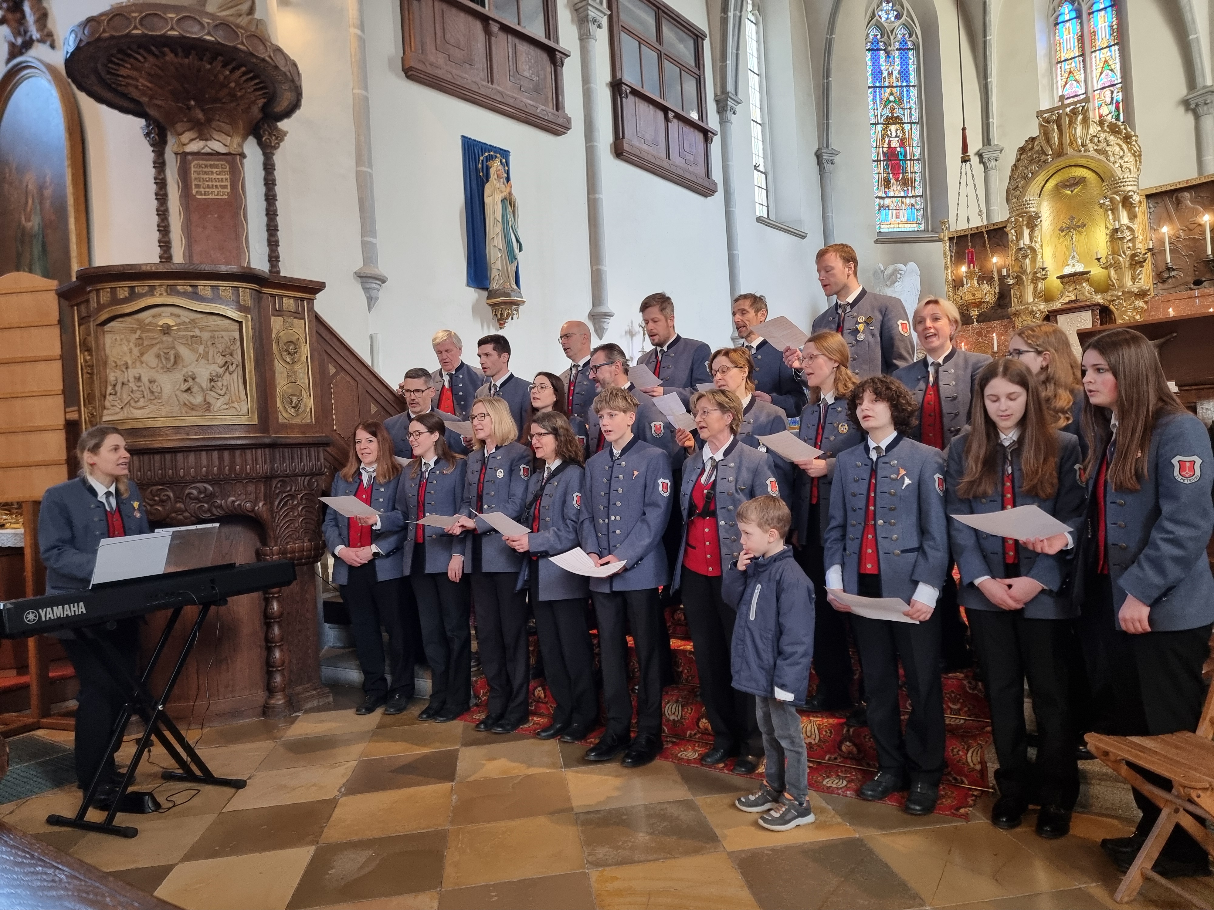 Am Ende überraschte die Musikkapelle die zahlreichen Kirchenbesucher mit einer eindrucksvollen Klangkulisse: Eingeleitet von Trommelschlägen und Oboensolo gaben die in der Kirche verteilten Musiker:innen „Highland Cathedral“ zum Besten. Auch die Musijugend durfte nicht fehlen und gestaltete den Festgottesdienst mit.