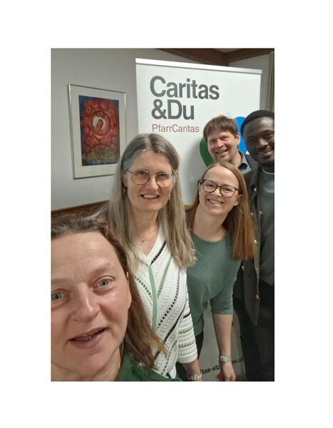 Mit großem Engagement organisierte Susanne Fehringer zum Kino ein Treffen einiger Referenten: von der Pfarrcaritas der Diözese St. Pölten Dekanats-Referentin Ilse Kappelmüller, Julia Wieser und Lukas Steinwendtner, zwei österreichische Mitarbeiter der Caritas Auslandhilfe und Emanuel Yera Boubane aus dem Senegal. Emanuel ist in Senegal bei der Betreuung verschiedener Projekte von der Caritas in führender Position und Funktion tätig.