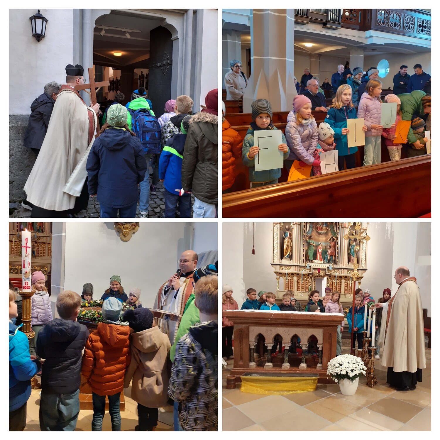 Die Wieder-Eröffnungsfeierlichkeiten begannen am Freitag, 24. Oktober, mit einer Feier, besonders für Kinder. Alle versammelten sich gemeinsam vor der Kirche. Nach dem Anklopfen öffnete sich die Kirchentür. Mit einem Alphabet symbolisierten die Kinder dann den christlichen Kontext vom Anfang bis zum Ende. Beim Taufwasserbecken erklärte Pfarrmoderator Mag. Alexander Fischer die Segnung, man erfährt dabei Zuwendung, Schutz und Beistand. Wasser spielt dabei eine gesegnete Rolle, sowie im gesamten Leben. Die Kinder versammelten sich dann rund um den Altar, erfuhren über Weihe-Rituale mit Weihrauch und durften selbst Weihrauch auf brennende Kohlen streuen, damit der Rauch nach oben aufsteigt und die Gebete der Menschen symbolisch zu Gott trägt. Mit einigen Liedern und dem Segen vom Pfarrmoderator kam die Feier zum Abschluss.