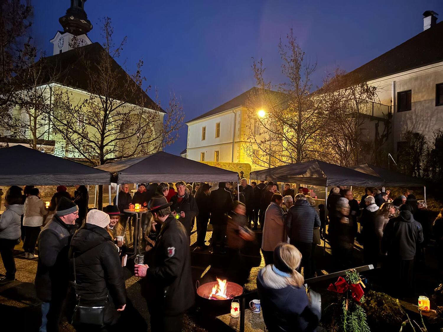 Im Anschluß an diese schöne Feier gab es beim Pfarrhof eine Agape. Gut vorbereitet und durchgeführt von den Pfarrgemeinderäten aller Pfarren des Pfarrverbandes, mit Lebkuchen, Glühwein, Brot und knisternden, flackernden, wärmenden Feuerkörben. In adventlicher Abenstimmung war die Agape ein Treffpunkt für viele Gespräche zum gegenseitigen Kennenlernen, Austauschen, plaudern und verweilen. Bei dieser gemütlichen und netten Stimmung hatten viele die Möglichkeit zu einem persönlichem Gespräch mit unserem neuen Pfarrer. Sein umgängliches und freundliches Wesen kam dabei besonders zur Geltung.