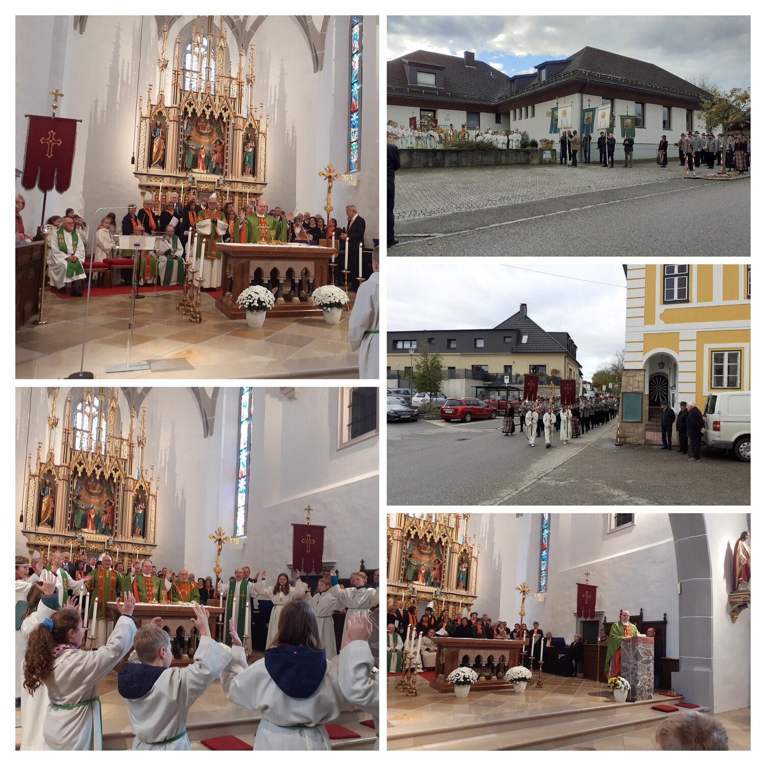 Beim Einzug in die Kirche wurden alle stimmgewaltig begrüßt vom Projektchor - Pfarrverband St. Petrus im Mostviertel, unter der Leitung von Josef Schmid aus Weistrach und Marlies Tanzer aus St. Peter/Au, sowie einem Bläserensemble mit Karl Schleindlhuber, Michael Schönauer, Johannes Wieser und Johannes Fellner. An der Orgel brillierte Samuel Schaumberger aus Kürnberg. Die weitere feierliche Umrahmung der Hl. Messe gestaltete dieses große Ensemble sehr festlich.
