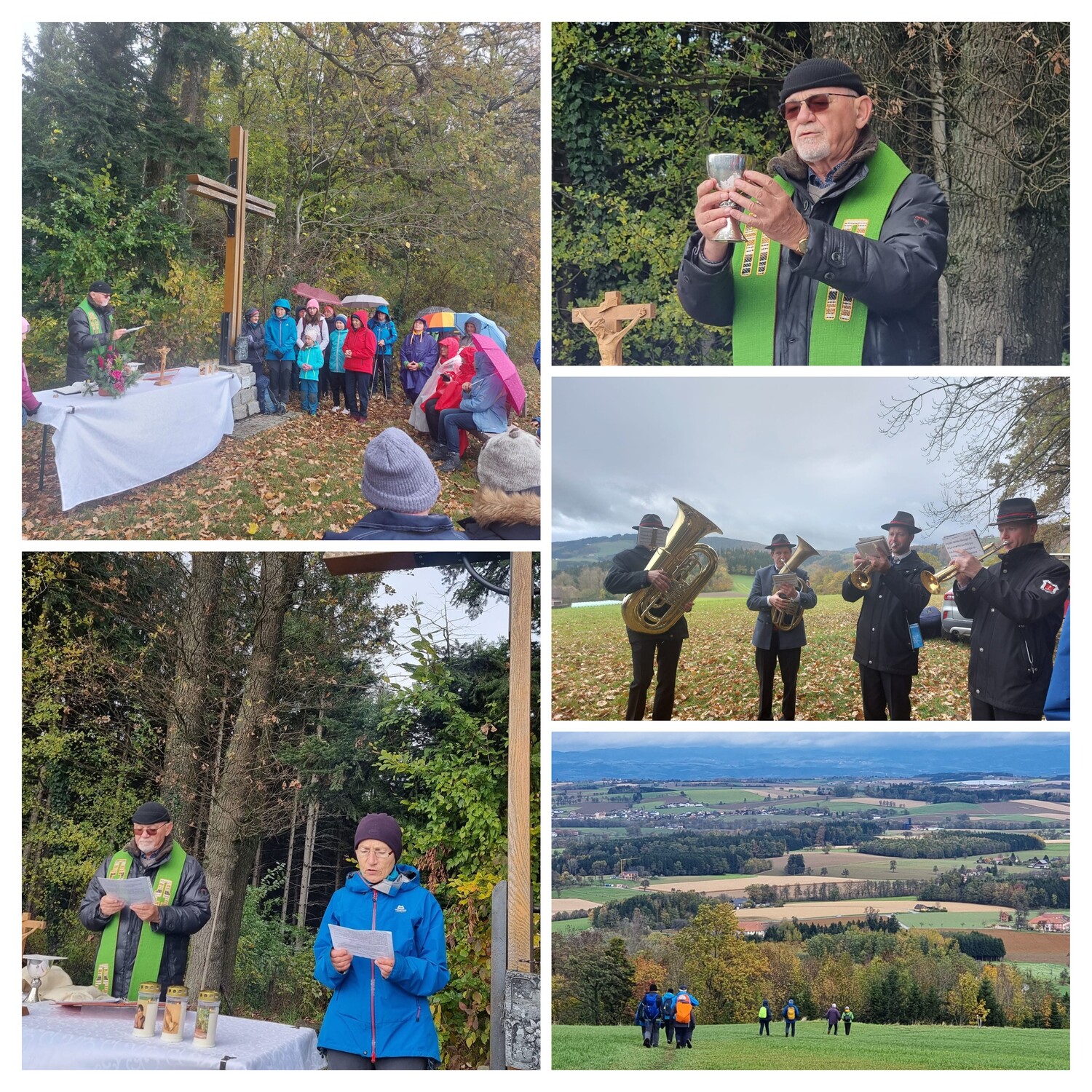 Trotz des unsicheren Wetters fand eine große Gruppe wetterfester Pilger und Wanderer den Weg zum Gipfelkreuz. Gemeinsam feierten alle einen Gottesdienst mit Hw. Pfarrer Anton Schuh, bei feucht-kühler herbstlicher Stimmung. Musikalisch umrahmte die Stockerkogl-Tanzlmusi die Feier.