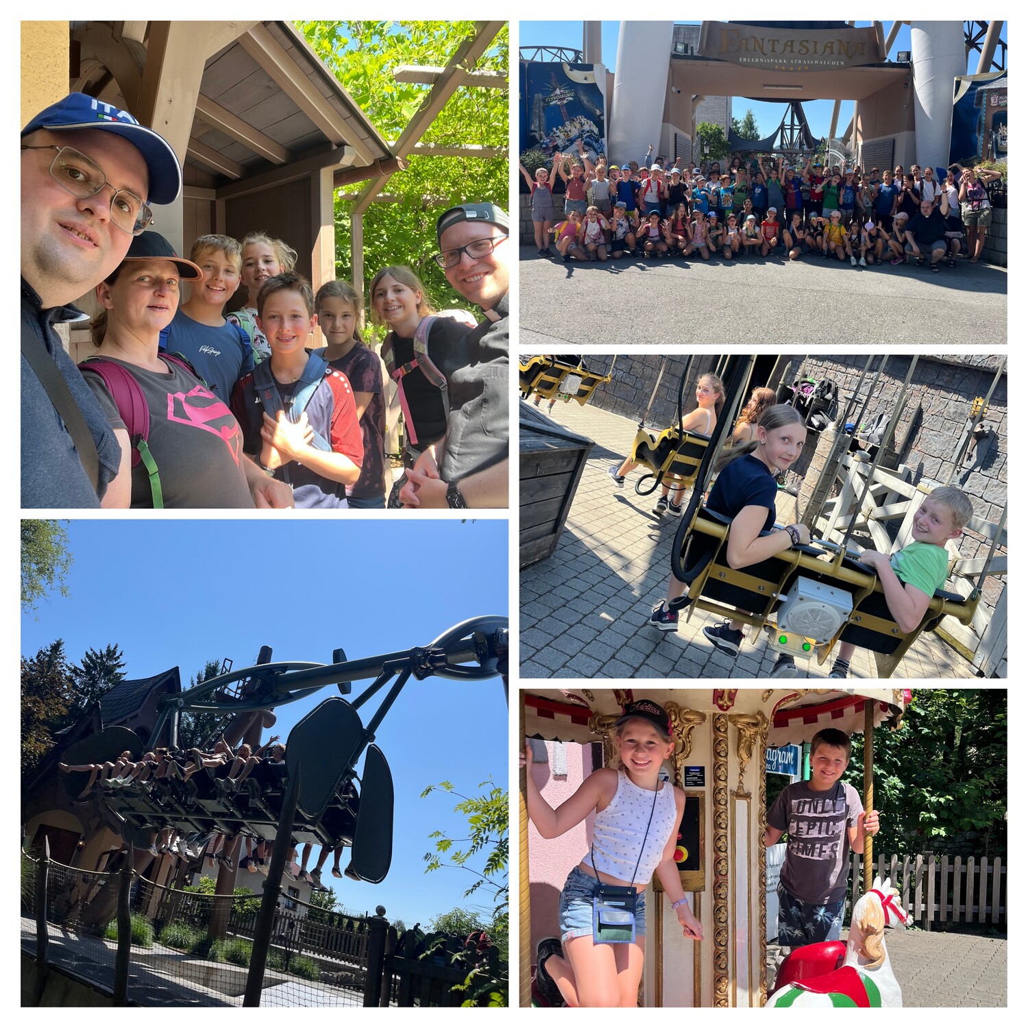 Aufgeteilt in Kleingruppen wurde der Erlebnispark erkundet. Der Fantasiana Erlebnispark bietet viele Attraktionen und Möglichkeiten für Spiel und Spaß! Die Hauptattraktion für die Kinder waren natürlich die Fahrgeschäfte. Alle Kinder probierten diese natürlich mehrfach aus und es machte viel Spaß – was oft deutlich hörbar war! Bei einigen Fahrgeschäften spritzte es auch heftig, das war jedoch eine willkommene Abkühlung. Für das leibliche Wohl ist im Park für alle bestens gesorgt und es gab auch herrliches Eis!