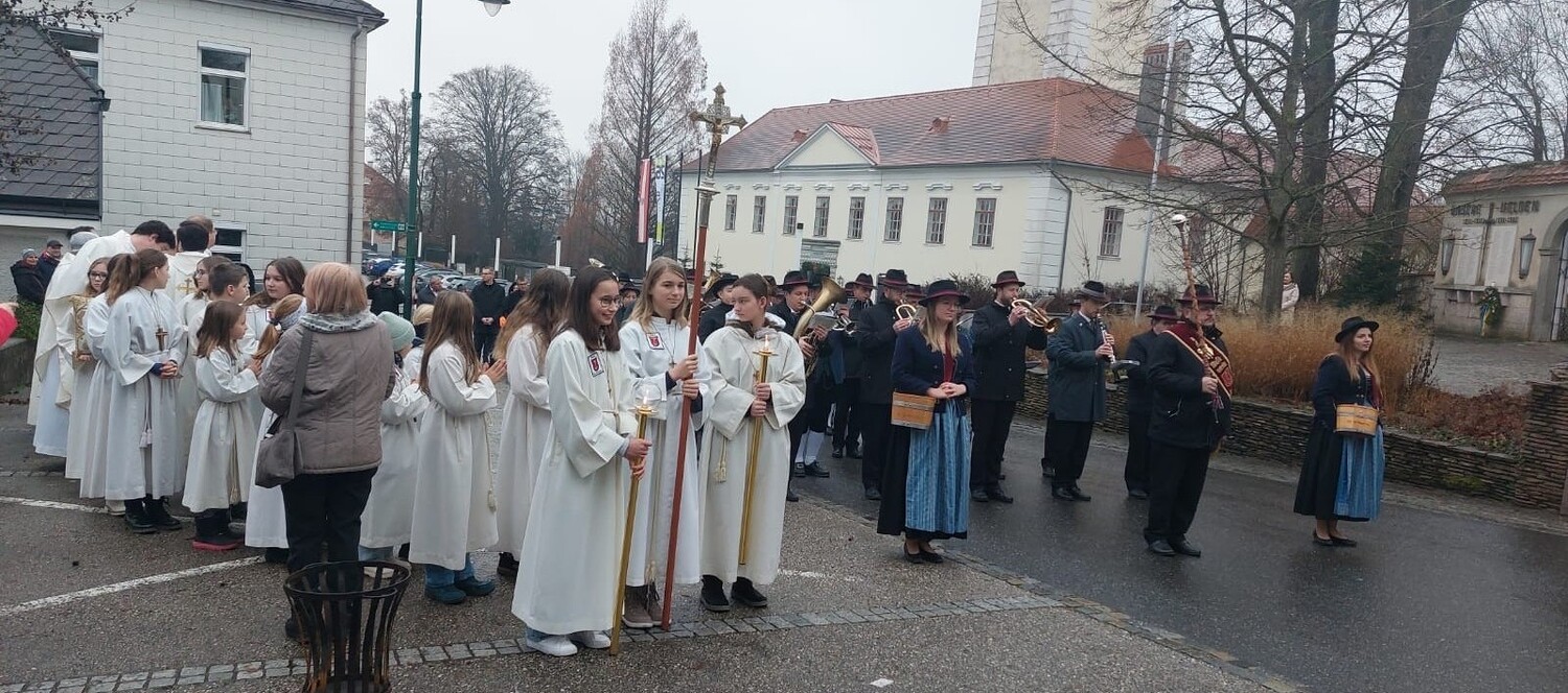 Im Festzug ging es dann vom Pfarrhof zur Kirche, angeführt von der Musikkapelle, gefolgt von zahlreichen Ministrant:innen, der hohen Geistlichkeit der Zelebranten und der Pfarrgemeinde.