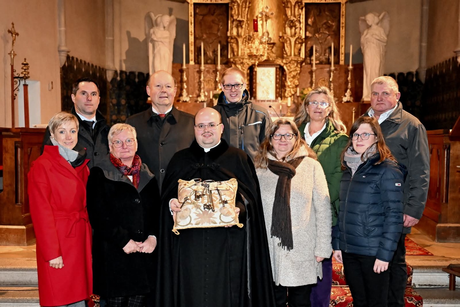 Vor der Kirche übergaben die Vorsitzenden Pfarrkirchenrat Stv. vom Pfarrverband, aus St. Peter/Au Anton Höritzauer - vertreten durch Christoph Ratzberger, aus Weistrach Karl Stöckler, aus Ertl Ferdinand Schenkermayr - vertreten durch Marie-Therese Hartig und aus Kürnberg Franz Huber, die Schlüssel der vier Kirchen, mit einem eigens dazu angefertigten Schlüsselanhänger, an Pfarrverbands Pfarrer Alexander Fischer.