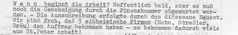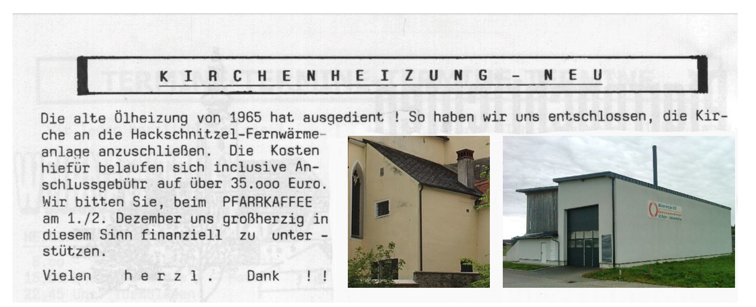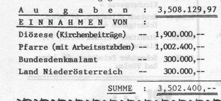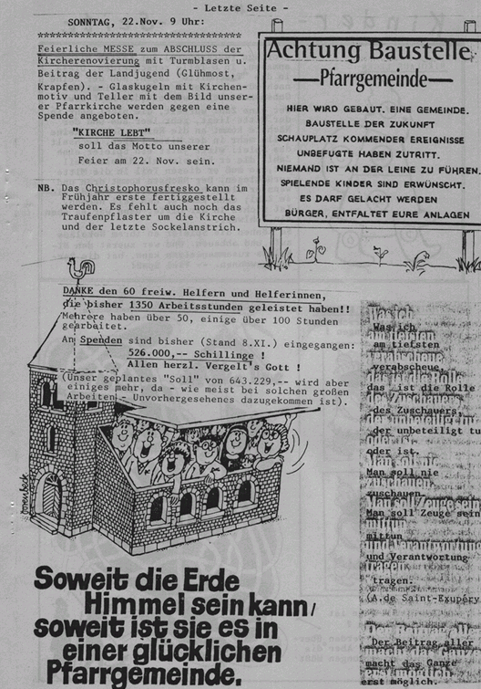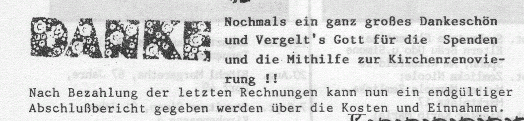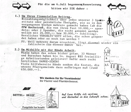 Zur Außenrenovierung der Pfarrkirche finden sich in den Pfarrbriefen vier Berichte, davon ist im letzten die Abrechnung. Mithilfe von der Pfarrgemeinde wurde bravourös geleistet! Ganz viele Helfer standen im wahrsten Sinn des Wortes ihren Mann. Die Spenden flossen auch großzügig. Als Abschluss wurde ein großes Fest gefeiert. Alle angeführten Beträge sind in Schilling.