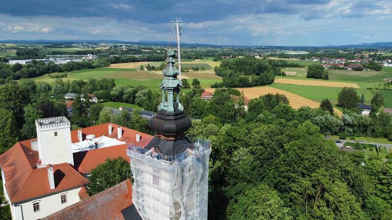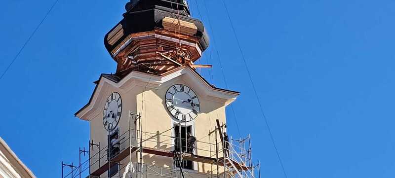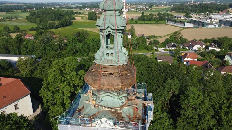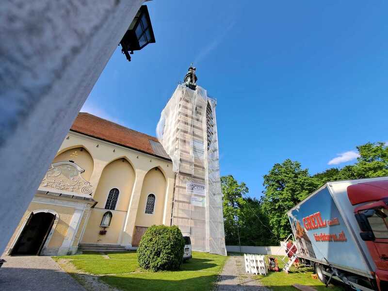 Den Anfang macht die Renovierung des Turmes. Nach langer Vorbereitung wurde das Gerüst durch die Firma Luftensteiner aufgestellt. Anschließend kamen über die Firma Lehner Spezialisten für denkmalgeschützte Gebäude und zwar die Firma Greil aus Osttirol. Mitte Mai montierten sie das Kreuz und die Zierteile (ca. 40 Stück) ab, welche wieder vergoldet werden. Danach wurde das Kupfer unterhalb der Laterne (oberster durchsehbarer Teil) entfernt. Auch die Holzverschalung darunter musste ausgetauscht werden, damit die Deckung wieder viele Jahre hält. Die tragende Holzkonstruktion ist noch in gutem Zustand.