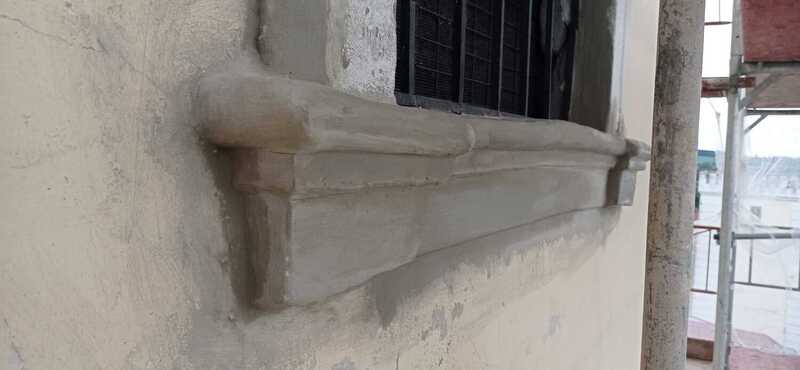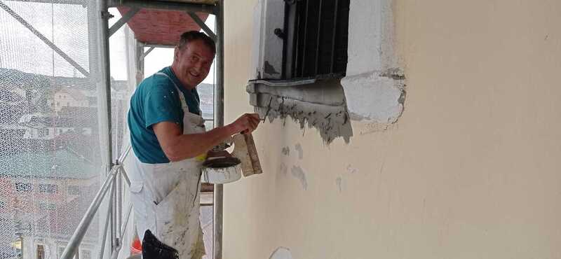 Währenddessen wurden auch einige lose Teile der Fassade des Turmes von freiwilligen Helfern abgeschlagen. Die Ausbesserungen des Putzes am Gesims und an der Fassade wurde von der Firma Stöckler durchgeführt. Maler Stressler ist mit der Ausbesserung und Grundierung bereits fertig.