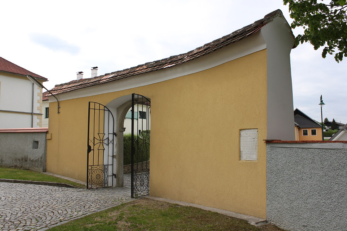 Der Kirchhof ist weitgehend mit ursprünglich höheren Wehrmauern und Futtermauern teils aus der 2. Hälfte des 15. Jahrhunderts umschlossen. Zwei Schlüsselscharten und eine Schlitzscharte sind erhalten. Das zweigeschossige Mesnerhaus mit Satteldach im Süden, im Kern aus dem 15. Jahrhundert, ist Teil der Umfassung des Hofes. Es gibt eine Grabtafel zu Maria Clara Staudin aus dem 18. Jahrhundert. An der erhöhten Ummauerung im Westen mit einem barocken Rundbogenportal und einem Schmiedeeisengitter aus 1954 wurde 1958 außen zum Vorplatz ein Kriegerdenkmal mit einem Steinrelief Hl. Georg vom Bildhauer Kunibert Zinner situiert.