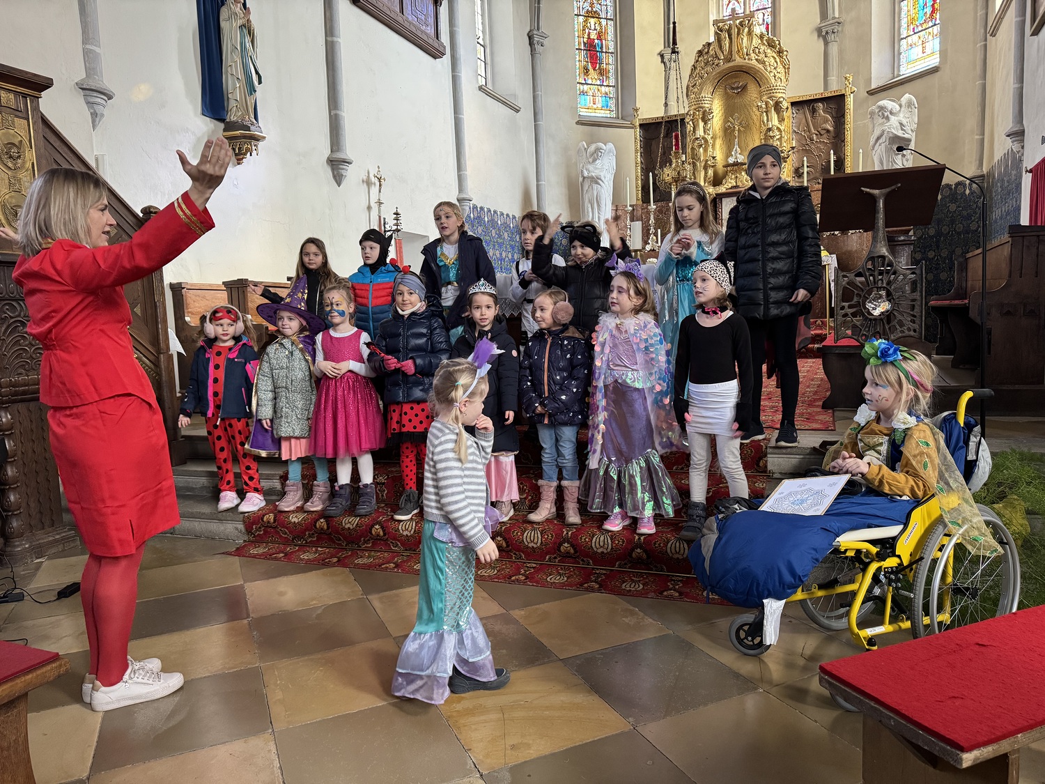 Zum ersten Mal sang der Kinderchor der Pfarre St. Peter/Au unter der Leitung von Fr. Lisa Wieser. 17 Kinder sangen ein fröhliches „Lasst uns miteinander“ zum Beginn, umrahmt von Gesten und Klatschen. Pfarrmoderator Alexander Fischer griff das Thema „Verkleidung“ in seiner aktiven Predigt mit den Kindern auf. Die Fürbitten wurden „in Reimform“ vorgetragen und der Kinderchor schloss die Messe mit dem um getexteten „Wer hat an der Uhr gedreht“.