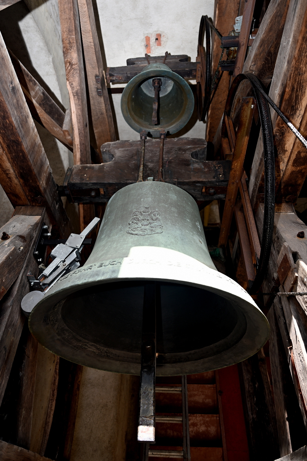 Die heutigen Glocken aus der Glockengießerei St. Florian wurden am 25.09.1949 (1-3 mit 460kg, 318kg und 202kg) bzw. am 11.04.1955 (große Glocke, 850kg, mit Inschrift: ‚‚Der Hl. Familie bin ich geweiht, sie führ mich durch die Stürme der Zeit, in eine glückliche Ewigkeit‘‘) geweiht und klingen in den Tönen as, b und des, bzw. f (,,Parzivalstimmung‘‘)