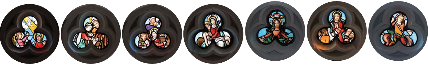 v.l.n.r.: Verkündung, Weihnachten, Hl. Familie bei der Arbeit, Pietá, Krönung Mariens, Maria Himmelfahrt, Hl. Michael